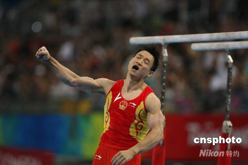 8月14日,中國奧運“三朝元老”楊威在北京奧運會體操男子個人全能決賽中力壓群雄,以94.575分,高出亞軍2.6分的較大優勢,奪得這塊體操個人項目中分量最重的金牌,他也成為繼李小雙之后中國體操的第二位個人全能奧運冠軍。中新社發 武仲林 攝
