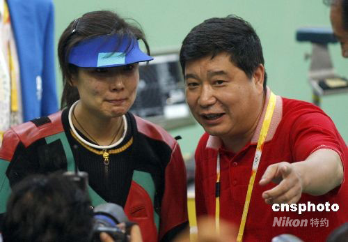 賽后,主教練王義夫走下看臺祝賀杜麗獲金。中新社發 盛佳鵬 攝