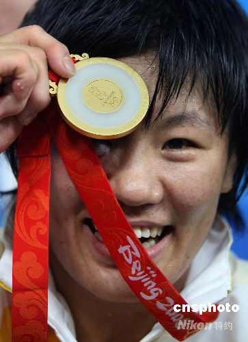 8月14日晚,中國女子柔道名將楊秀麗在北京奧運會女子柔道78公斤級決賽中擊敗古巴名將亞倫妮斯·卡斯蒂略獲得冠軍,將金牌收入囊中。中新社發 任晨鳴 攝