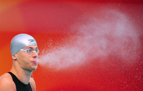 8月15日,一名巴西選手在參加完男子50米自由泳預(yù)賽后上岸,噴出一道水霧。