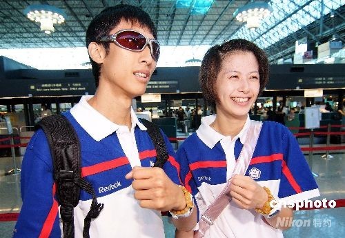 8月15日,中華臺北跆拳道選手朱木炎(左)、楊淑君飛赴北京參加奧運比賽,兩人在機場都秀出日前求來的佛珠,希望一路平安、比賽順利。中新社發 CNAsports 攝
