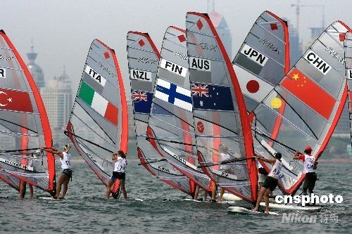 8月15日,青島奧帆中心,大型帆船托納多級和星級首次進入比賽,中國選手首次露面。男女帆板各國選手繼續激烈競爭,中國女子帆板殷劍努力拼爭,試圖保持自己的總排名第一位置,奪金有望。中新社發 肖冰 攝