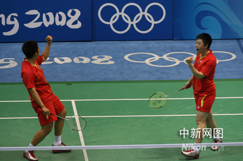 8月15日晚,中國組合杜婧、于洋在北京奧運會羽毛球女子雙打決賽中以2比0戰勝韓國組合李孝貞、李敬元,奪得金牌。中新社記者 武仲林 攝