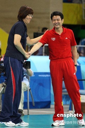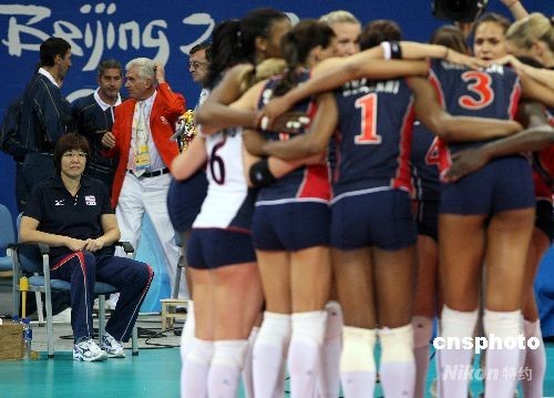 8月15日晚,北京奧運會女排小組賽中國與美國之戰在北京奧運會排球比賽館--首都體育館舉行,這場被戲稱為“和平大戰”的比賽最后時刻,兩名美國選手封死了中國隊王一梅的扣殺而以3比2戰勝中國女排。中新社發 任晨鳴 攝