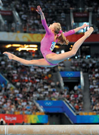 昨天中午,國(guó)家體育館中,女子體操全能決賽的最后一個(gè)項(xiàng)目是自由體操,美國(guó)選手柳金倒數(shù)第二個(gè)出場(chǎng),這位19歲女孩有著高挑的身材和柔美的氣質(zhì)。隨著一曲充滿俄羅斯風(fēng)情的《黑眼睛》,身著粉衣的柳金開始了技驚四座的表演,只見她以一串又高又飄的跟頭精彩亮相,而后柳金憑借優(yōu)雅舒展的舞蹈和流暢而富有張力的動(dòng)作贏得了觀眾雷鳴般的掌聲,最后當(dāng)她以輕輕的踢腿動(dòng)作在場(chǎng)地上定格時(shí),全場(chǎng)沸騰了。盡管最后一名隊(duì)員肖恩還沒有上場(chǎng),但如此精彩的演出足以讓她得到金牌。