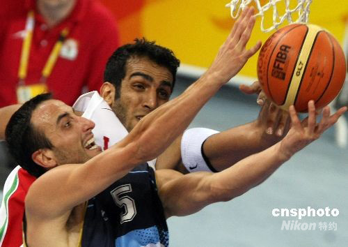 8月16日,北京奧運會男子籃球小組賽第四輪比賽在五棵松籃球館舉行,雅典奧運會冠軍阿根廷隊以97比82擊敗亞洲亞軍伊朗隊,隊中“老大”、效力于NBA馬刺隊的球星吉諾比利砍下全場最高的32分。中新社發 任晨鳴 攝