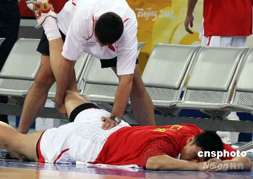 8月16日,北京奧運會男子籃球小組賽第四輪比賽在五棵松籃球館舉行,為了爭奪小組出線權而躋身八強之列,由姚明率領的中國隊與由諾維斯基、卡曼率領的德國隊展開“生死大戰”之前兩小時,中國隊就到達賽場,姚明在場地內一邊“偷窺”德國隊的訓練,一邊接受火箭隊隊醫的專門治療。中新社發 任晨鳴 攝