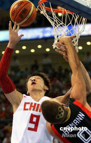 中國隊的后衛孫悅嚴防德國隊中鋒哈曼的扣籃。