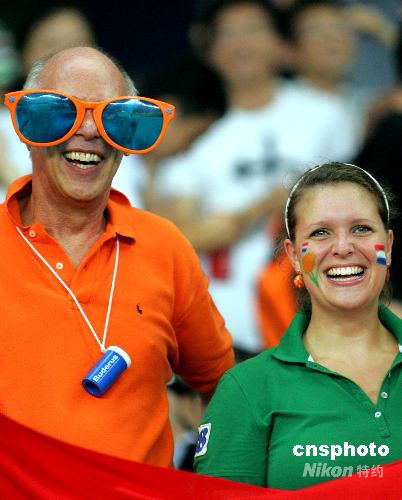 8月16日,北京奧運會男足阿根廷對陣荷蘭的比賽在上海體育場進行。一位荷蘭球迷帶著一副巨型眼鏡在比賽現場觀看比賽,吸引了不少好奇的目光。中新社發 湯彥俊 攝