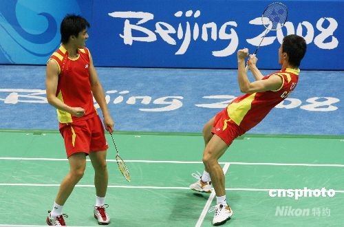 8月16日晚,中國選手蔡赟、傅海峰在北京奧運會男子雙打決賽中不敵印度尼西亞選手馬爾基斯·基多、亨德拉·塞蒂亞萬,獲得銀牌。中新社發 武仲林 攝