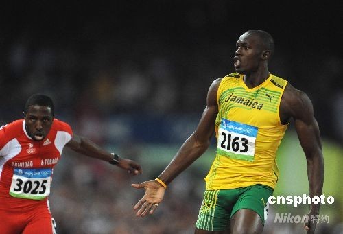8月16日晚,牙買加選手尤塞恩·博爾特在中國國家體育場“鳥巢”進行的北京2008年第二十九屆奧運會男子100米決賽中,以9秒69的成績奪得金牌并打破9秒72的世界紀錄。中新社發 古玉 攝