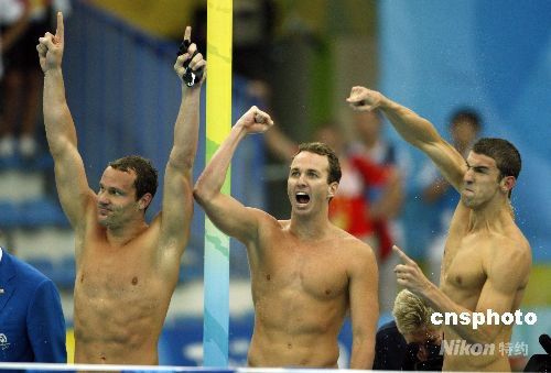 8月17日,美國隊獲得北京奧運會男子4乘100米混合泳接力冠軍,至此,23歲的美國游泳運動員菲爾普斯不僅用8金刷新了單屆奧運會金牌紀錄,而且還將個人所有奧運會的金牌總數提高到了14枚,達成了他人難以超越的“世界紀錄”。 中新社發 杜洋 攝