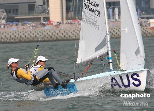 8月18日,北京2008奧運帆船比賽在青島分賽場舉行,澳大利亞隊內森·威爾莫特、馬爾科姆·佩奇組合和埃莉斯·雷基基、特莎·帕金森組合分獲男子雙人艇四七0級和女子雙人艇四七0級冠軍。中新社發 趙振清 攝