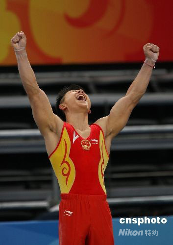 8月18日,中國選手陳一冰在北京奧運會吊環決賽中表現出色,奪得金牌。中新社記者 武仲林 攝