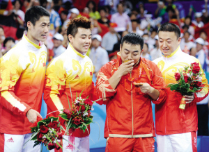當(dāng)三位隊員戴上沉甸甸的金牌,王勵勤向臺下的人指了指,王皓、馬琳也急忙揮手,不一會劉國梁終于走上了頒獎臺,只見王皓與馬琳一左一右摟著劉國梁,然后隊員們紛紛摘下自己的金牌套在他的脖子上,中國男團的眾志成城、團結(jié)一心叫人印象深刻,他們所做的一切為的就是完成國人對于國球不變的期望。