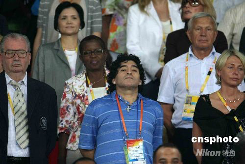 8月19日晚,北京奧運會男足第二場半決賽在北京工人體育場舉行,球王馬拉多納到場觀看巴西、阿根廷兩強遭遇戰。 中新社發 任晨鳴 攝