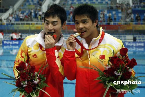 8月19日晚,在國家游泳中心“水立方”進行的北京奧運會男子3米跳板決賽中,中國選手何沖以572.90分奪得金牌,中國代表團金牌總數增至43枚。 中新社發 杜洋 攝