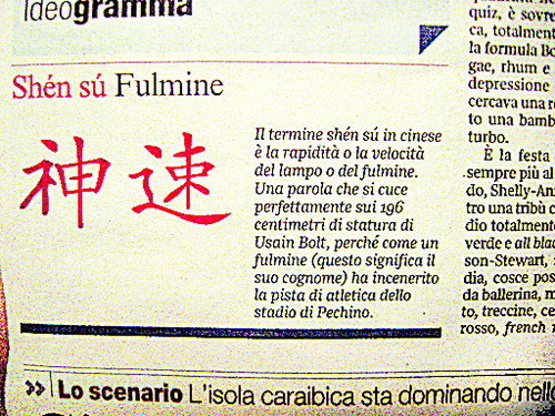 這個“漢字”專欄自北京奧運會開幕之日起,每天一期、每期一詞,每個詞都標注拼音,引出一段新聞。如8月8日的專欄詞匯是“鳥巢”,在這兩個漢字下面用意大利語解釋了“鳥巢”在漢語中的本意,介紹了北京的國家體育場,并配上焰火照耀下的“鳥巢”夜景圖片。其后的專欄相繼刊登了“文身”、“興奮劑”、“球門”、“地區(qū)”、“神速”等漢語詞匯。在漢字“興奮劑”下報道的新聞是:奧組委為實現(xiàn)“干凈的奧運會”已向興奮劑宣戰(zhàn),北京設(shè)立了由220名高級專家組成的超級檢測中心,每天檢測數(shù)量達250例。“神速”一詞解讀的新聞是:這個在漢語中意為閃電般快速的詞,恰如其分地描繪了飛人博爾特17日晚破百米紀錄的情景。這名身高196cm的運動員,以其閃電般的速度征服了北京國家體育場內(nèi)的所有觀眾。(記者穆方順)