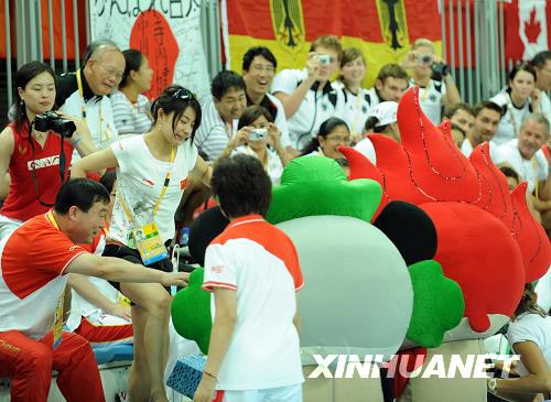 8月19日,中國選手郭晶晶在觀看比賽前和福娃合影。當日,北京奧運會跳水比賽在國家游泳中心——“水立方”繼續進行,何沖在男子3米跳板決賽中獲得冠軍。 新華社記者趙鵬攝