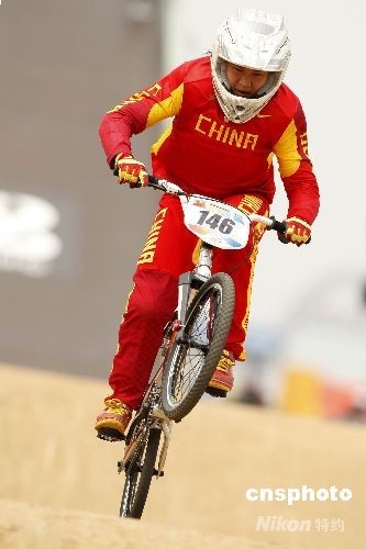 8月20日,北京奧運會小輪車比賽在老山小輪車賽場展開較量。在女子競速計時賽的兩輪排位賽中,中國選手馬麗蕓排在最后一位,被分在了半決賽的第一組。圖為馬麗蕓在比賽中。
