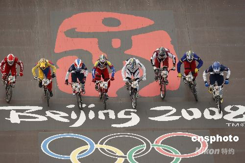 8月20日,北京奧運會男子小輪車競速賽在北京老山小輪車賽場進(jìn)行了1/4決賽的爭奪。經(jīng)過三輪的較量,最終來自世界各國的16位選手成功進(jìn)入了半決賽的較量,他們將在明天展開新一輪的爭奪。圖為比賽現(xiàn)場。 中新社發(fā) 盛佳鵬 攝