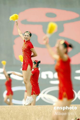 8月20日,北京奧運會小輪車項目的比賽在北京老山小輪車賽場拉開戰幕,啦啦隊現場助威。中新社發 盛佳鵬 攝