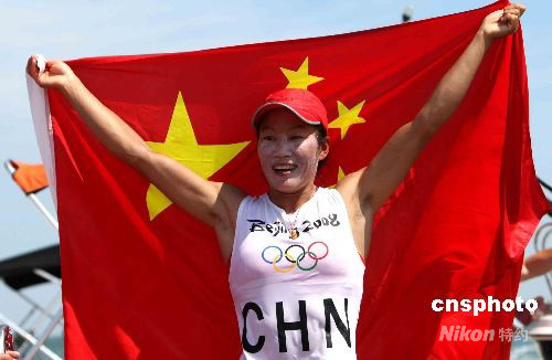 8月20日,北京2008奧運帆板比賽在青島分賽場舉行,中國四川姑娘殷劍奪得女子帆板冠軍,這也是中國代表團在奧運會歷史上取得的第一枚帆船項目的金牌。中新社發 趙振清 攝
