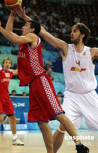 8月20日,北京奧運(yùn)會(huì)男子籃球八進(jìn)四淘汰賽在五棵松籃球館開戰(zhàn),2006年世錦賽冠軍西班牙隊(duì)在球星保羅·加索爾的率領(lǐng)下,以72比59戰(zhàn)勝歐洲勁旅克羅地亞隊(duì)。保羅·加索爾(白)上場(chǎng)26分鐘,砍下全場(chǎng)最高的20分。中新社發(fā) 任晨鳴 攝