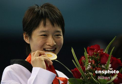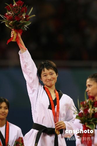 8月20日晚,北京奧運會跆拳道女子49公斤級以下決賽在北京科技大學體育館舉行,中國選手吳靜鈺以1:-1戰勝泰國選手布特蕾·貝德蓬獲得冠軍,成為中國跆拳道在本屆奧運會上奪得的第一枚金牌,也是中國代表團在本屆奧運會上獲得的第45枚金牌。 中新社發 武仲林 攝