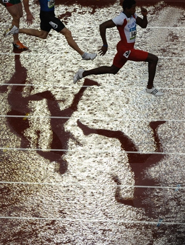 8月21號上午,在國家體育場“鳥巢”進行的北京奧運會田徑比賽迎來大雨,運動員們在雨中競技。