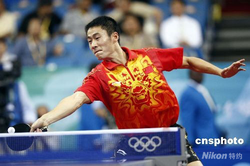 8月21日,北京奧運會乒乓球男子單打第三輪的比賽在北京大學(xué)體育館進(jìn)行,中國選手王勵勤4比0戰(zhàn)勝波蘭選手盧希安·布拉什切克,晉級下一輪比賽。中新社發(fā) 盛佳鵬 攝