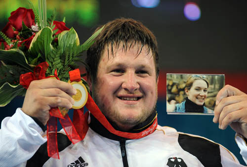 19日北京奧運會男子舉重105公斤以上級的頒獎儀式上演了感人一幕:該項目冠軍、德國選手馬•施泰納把亡妻蘇珊的照片和奧運金牌高高舉起。這位德國大力士用一枚沉甸甸的奧運金牌來祭奠亡故的妻子,此情此景令人不禁潸然淚下。