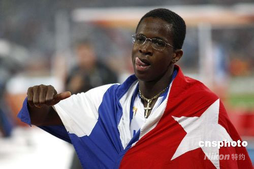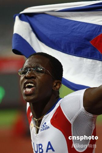 羅伯斯慶祝北京奧運男子110米欄奪冠。 中新社發 盛佳鵬 攝