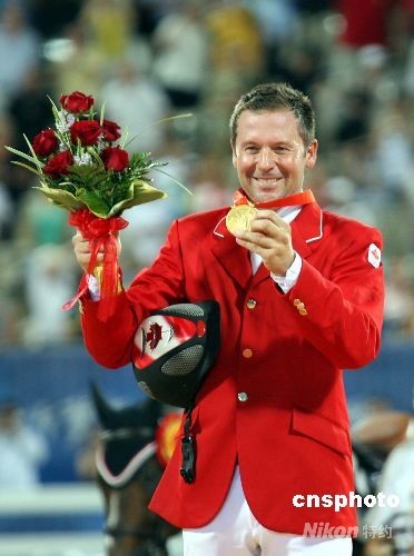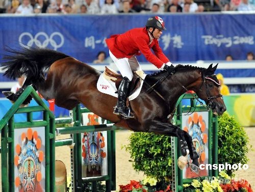 八月二十一日晚,奧運(yùn)馬術(shù)在香港沙田賽場(chǎng)舉行場(chǎng)地障礙個(gè)人賽決賽。加拿大選手埃里克·拉馬茲策騎馬匹“希克斯特德”贏得金牌。中新社發(fā) 鄧慶樂(lè) 攝