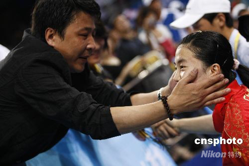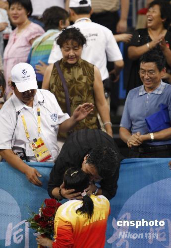 8月22日晚,在北京大學(xué)體育館進行的北京奧運會乒乓球女子單打決賽,中國乒乓球老將王楠抱憾負(fù)于隊友張怡寧獲得銀牌,在現(xiàn)場觀戰(zhàn)的王楠老公郭斌賽后撫慰愛妻。 中新社發(fā) 盛佳鵬 攝