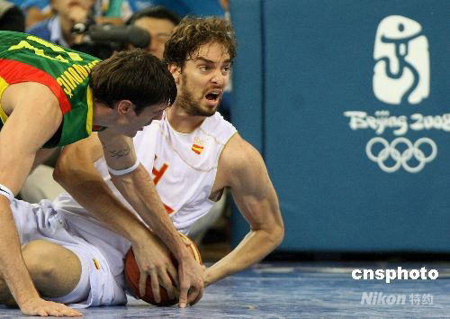北京奧運會男子籃球半決賽首場比賽8月22日晚在五棵松籃球館開戰(zhàn),2006年世錦賽冠軍西班牙隊以91比86艱難戰(zhàn)勝極為強悍的立陶宛隊,率先進入決賽。NBA球星4號保羅·加索爾砍下全場最高的19分。 中新社發(fā) 任晨鳴 攝