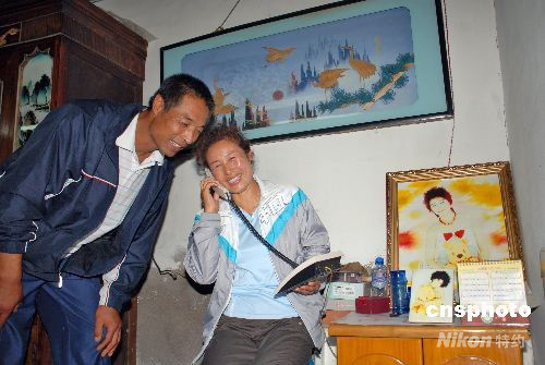 中國女子曲棍球隊在29屆北京奧運會奪得銀牌,賽后趙玉雕的父母在家鄉打電話給女兒。中新社發 谷進 攝