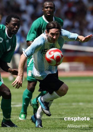 8月23日,北京奧運會男足決賽在奧運會主體育場——鳥巢舉行,雅典奧運會冠軍阿根廷隊以1比0戰(zhàn)勝非洲雄鷹尼日利亞隊,蟬聯(lián)冠軍。圖為阿根廷隊核心梅西策劃的一次進攻絕殺尼日利亞隊。 中新社發(fā) 任晨鳴 攝
