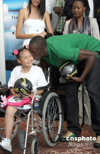 8月23日,北京奧運會田徑一百米、二百米比賽金牌獲得者牙買加運動員尤塞恩·博爾特親吻來自汶川映秀鎮因大地震受傷的小女孩黃思雨,并向她贈送一個簽名足球。當天,博爾特在北京向中國紅十字基金會捐贈善款五萬美元,以支持中國紅十字人道救助事業。中新社發 孫自法 攝