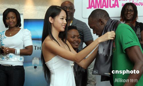 8月23日,世界小姐張梓林向北京奧運(yùn)會(huì)新科“飛人”、牙買加田徑運(yùn)動(dòng)員尤塞恩·博爾特贈(zèng)送一條圍巾,并一起合影留念。當(dāng)天,博爾特在北京向中國(guó)紅十字基金會(huì)捐贈(zèng)善款五萬(wàn)美元,以支持中國(guó)紅十字人道救助事業(yè)。 中新社發(fā) 孫自法 攝
