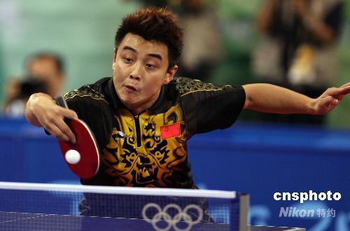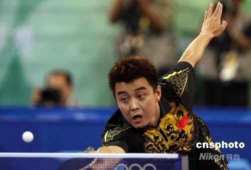 8月23日晚,王皓在北京奧運會乒乓球男子單打決賽中以1:4負于隊友馬琳,獲得亞軍。中新社發 武仲林 攝