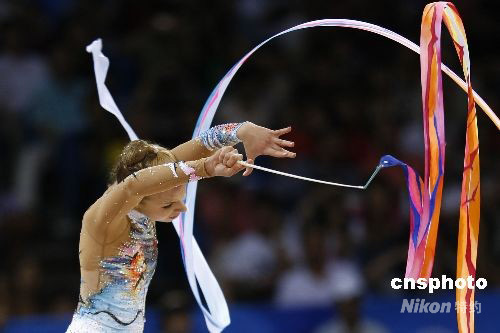 8月23日晚,在北京工業(yè)大學(xué)體育館舉行的北京奧運會藝術(shù)體操個人全能決賽中,白俄羅斯選手因娜·茹科娃獲得銀牌。圖為因娜·茹科娃在比賽中。 中新社發(fā) 盛佳鵬 攝