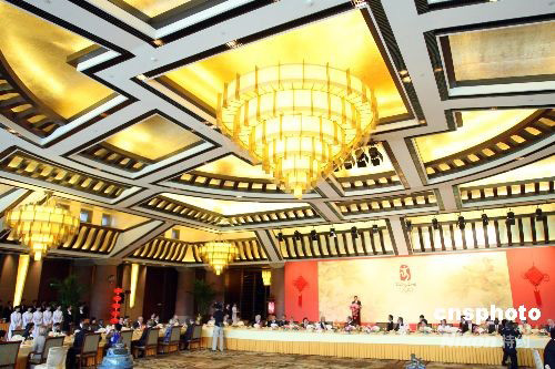 8月24日,中國國家主席胡錦濤和夫人劉永清在北京釣魚臺國賓館舉行宴會,款待前來出席北京奧運會閉幕式的國際貴賓。胡錦濤在宴會上致辭。中新社發 廖文靜 攝