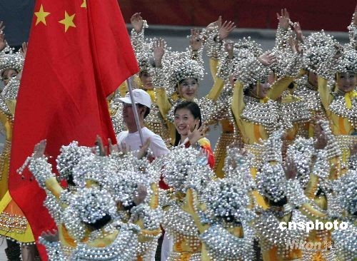 8月24日晚,第二十九屆夏季奧林匹克運動會在北京閉幕。33歲的羽壇老將、上屆及本屆奧運會羽毛球女子單打兩屆冠軍張寧擔任中國代表團旗手。中新社發 任晨鳴 攝