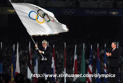 8月24日晚,第29屆夏季奧林匹克運動會閉幕式在北京國家體育場——“鳥巢”舉行。這是倫敦市市長約翰遜(左)手舉奧林匹克會旗。 新華社記者王雷攝