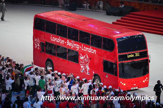 北京奧運會閉幕式舉行 8月24日晚,第29屆夏季奧林匹克運動會閉幕式在北京國家體育場——“鳥巢”舉行。這是倫敦巴士開進會場。 新華社記者郭大岳攝