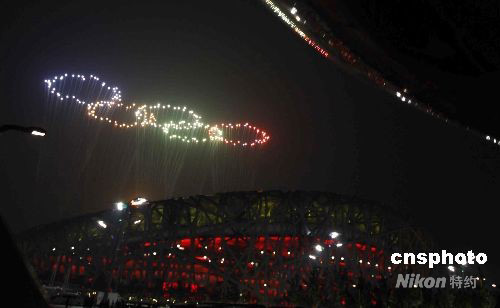 8月24日晚,第二十九屆夏季奧林匹克運動會在北京閉幕。閉幕式上燃放的彩色“五環(huán)”焰火獨特新穎。 中新社發(fā) 盛佳鵬 攝
