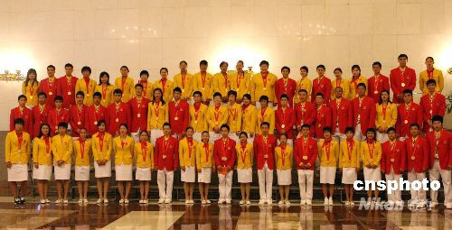 8月26日,2008年北京奧運會中國體育代表團總結大會在北京人民大會堂金色大廳舉行。圖為北京奧運會中國體育代表團金牌選手合影。中新社發 廖文靜 攝