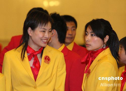 8月26日,2008年北京奧運會中國體育代表團總結大會在北京人民大會堂金色大廳舉行。郭晶晶、吳敏霞出席北京奧運會中國體育代表團總結大會。中新社發 廖文靜 攝