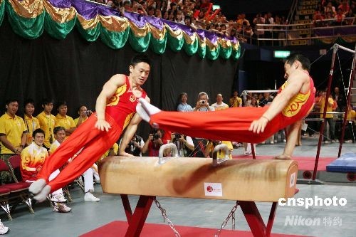 金牌選手楊威、肖欽作鞍馬精彩表演,博得全場熱烈的掌聲。中新社發(fā) 洪少葵 攝